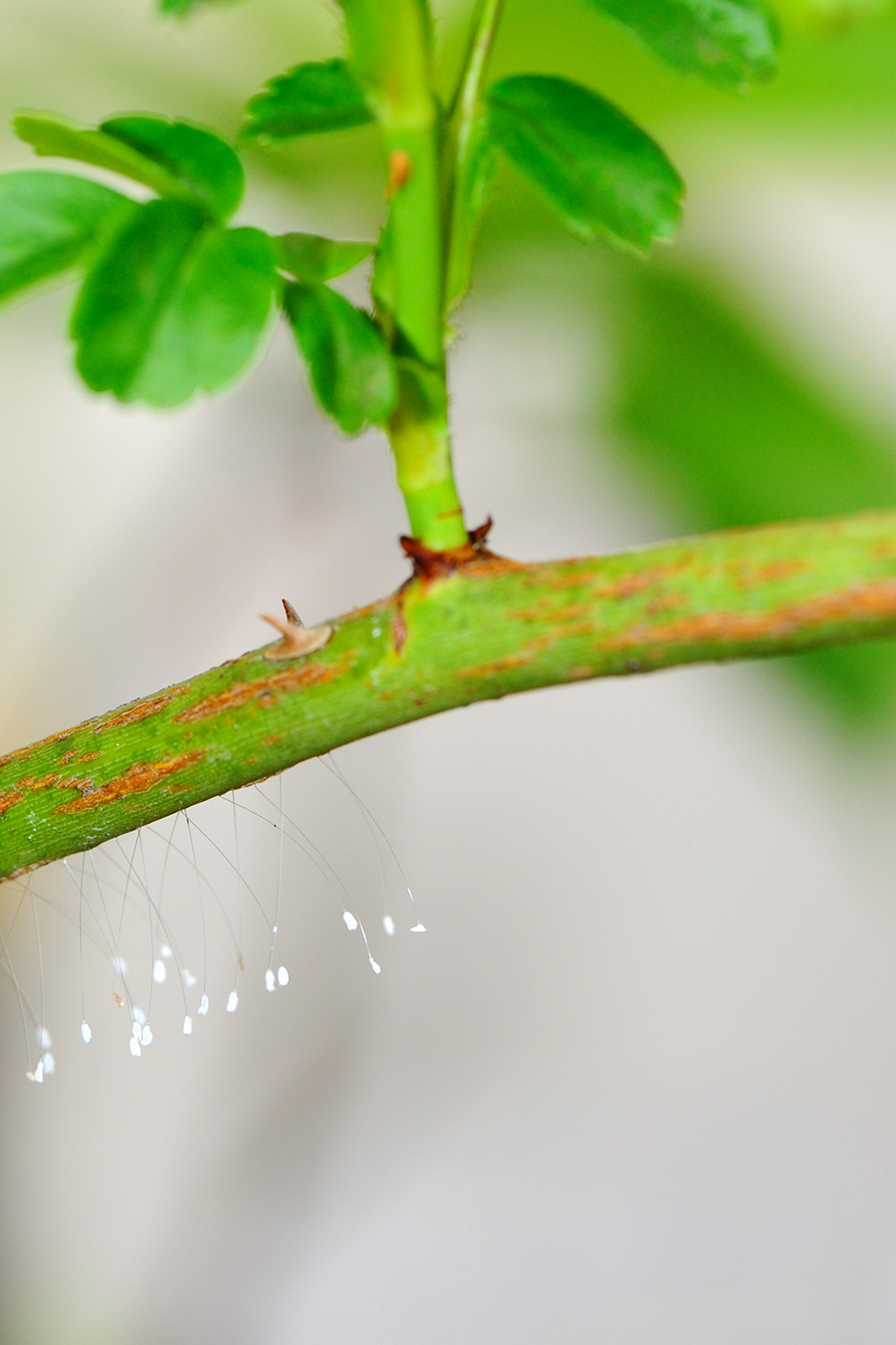 優曇華の花ともよばれるクサカゲロウの卵です。以前は室内でも電灯の笠で良く見かけましたが、さすがに最近は室内で見掛けることは無くなりました。これは自宅の薔薇の枝に下がっていたものです。