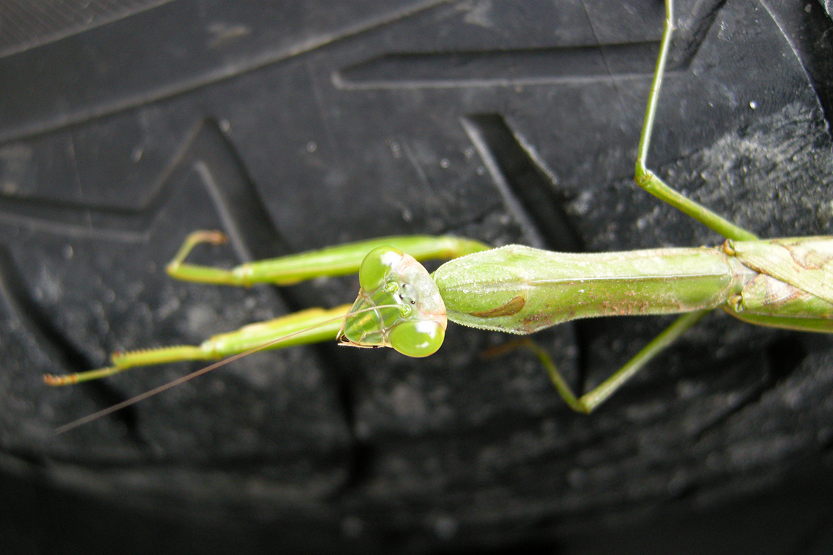 車を降りると隣の車の左前輪に大きなカマキリが登っていました。
