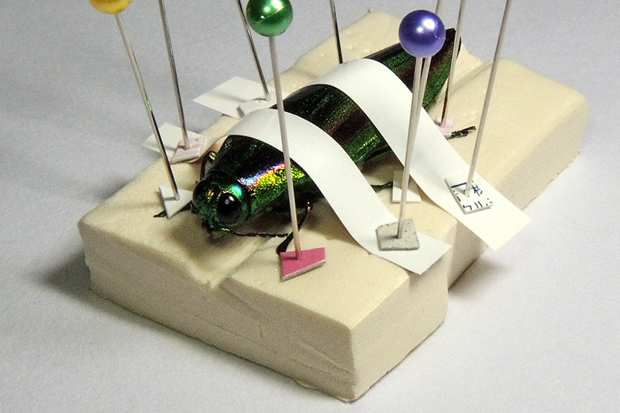 台紙に貼ったり、虫体にピンは刺していませんが、溝(緩いVですが)を掘ったため、虫体が回らずに済んでいます。この状態で足を整えると、虫体が浮いてしまうため、紙の帯で押さえています。この紙を押さえるのにも、ピンそのままだと、開いた穴で針が滑り、押さえの役を果たしてくれませんので、紙を押させるのにも使います。