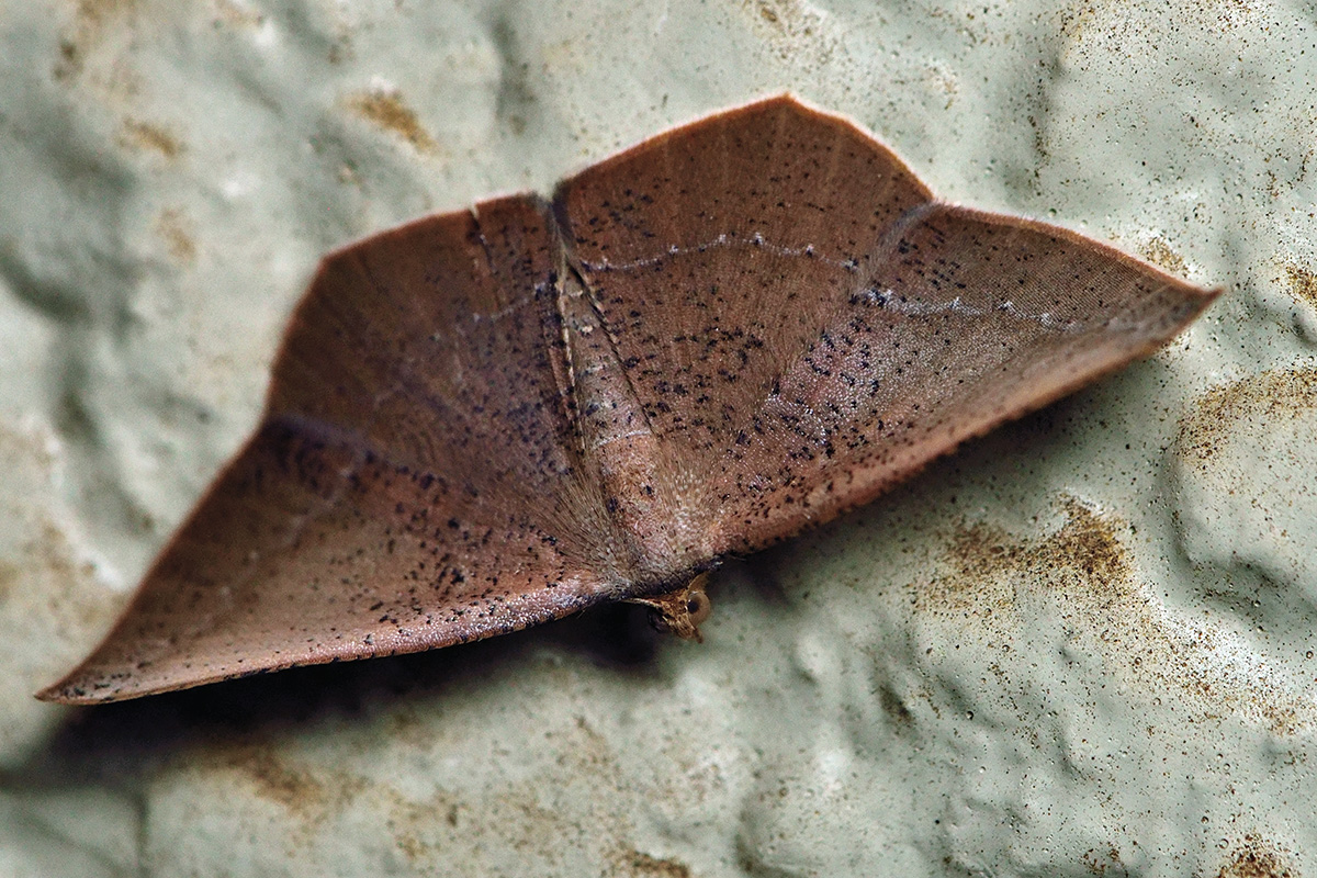 角度によって微妙に光沢感が異なりますが、近似のマエキオエダシャクに比べて黒点(斑)が多いなど比較的判り易い違いがあります。