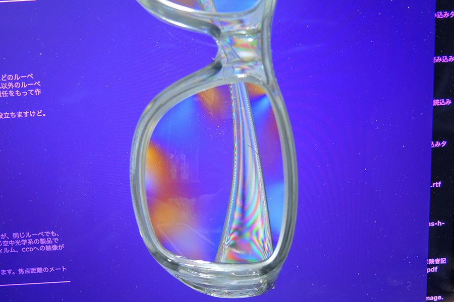 偏光を通してみると、結構歪んで見えますが、レンズが厚いので、実際それほどでもありません。