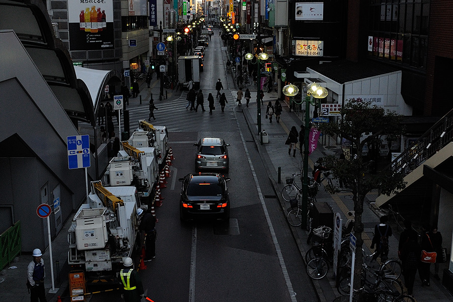 歩行者用信号を右に折れると目的の富士そばがあります。
