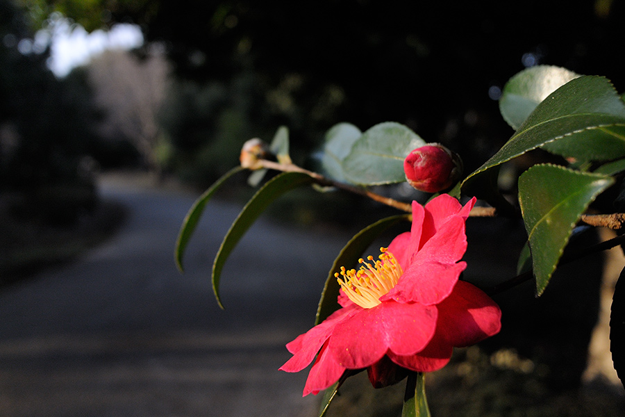 シロートとしてはツバキとの区別はつけておきたいと思うのでありますが、花が無いと葉はちと面倒かも知れません。花の時季は花弁がばらばらに落ちていればサザンカ、また雄しべがスーパーで売られているエノキのように途中繋がっている(合着:がっちゃく)のはツバキで、サザンカは独立性が強いです。花の無い季節の識別は、葉の鋸歯や毛、光沢などでできるようで、葉の主脈にも微毛があればサザンカのようです。