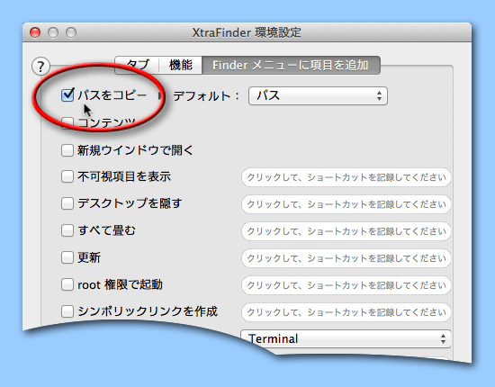 デフォルトではチェックが無いので、パスコピーをチェックします。