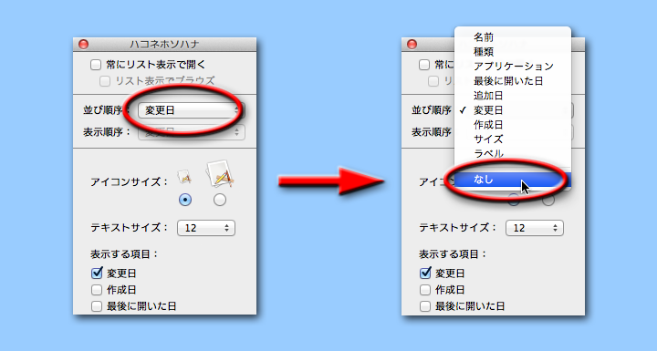 『リスト』と『Cover Flow』表示なら、このように名前や更新日、ラベル等で並び替えができるはずなんですが・・・