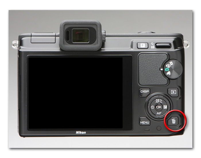 こちらは、ほぼ同じサイズの Nikon 1 V1の背面で、やはり削除ボタンは右下です。こちらは不用意に押されないようにボディ形状を工夫して、ボタンとその周囲をフラットにしてあります。
