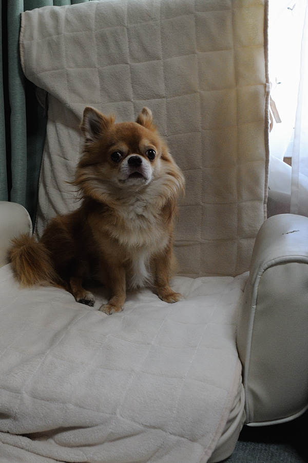 うろうろされても邪魔なので、座椅子に座らせていたら、