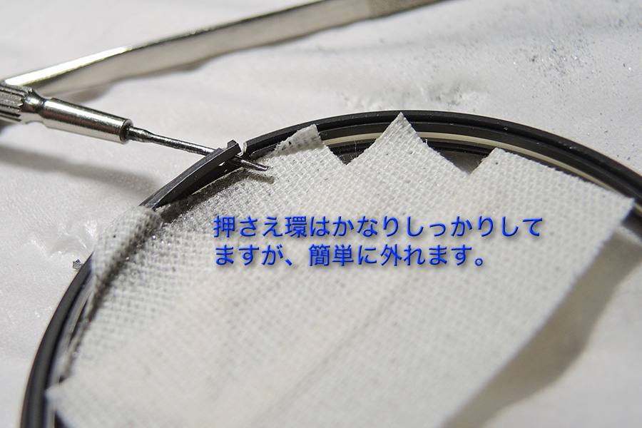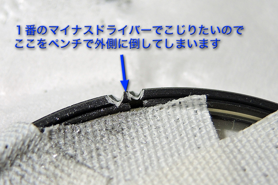 一番のマイナスドライバー(安物なので潰れてますね(∩_∩)ゞ)を、隙間から差し込んで、押さえ環を外します。