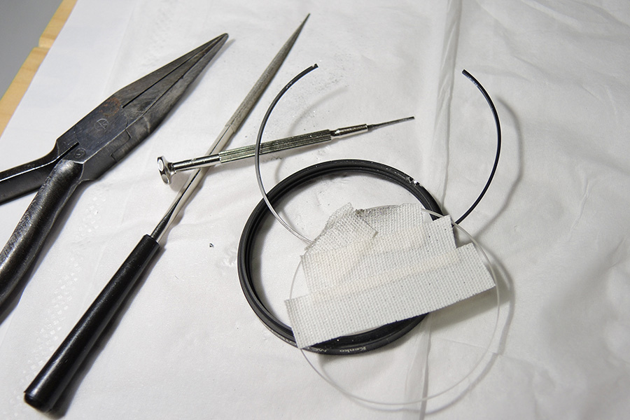 なお、簡易ディフューザにプラ板を使っているんですが、赤味を帯びてしまうので、昔使っていた淡いブルーのフィルタ(ニコン製)もガラスを外しておきました。こちらは枠が真鍮だったので、少し余分に時間が掛かりましたが、心配だった鑢(ヤスリ)の目詰まりも無く、簡単に外せました。