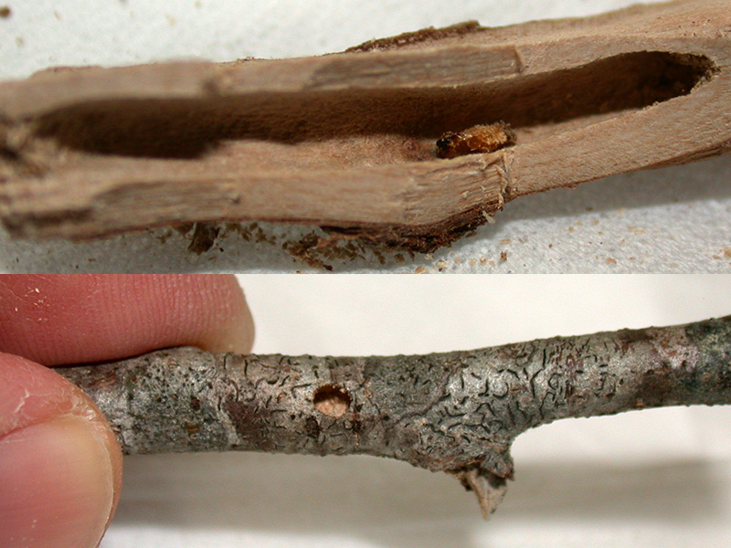 材(落ち枝+植物音痴ゆえ樹種は特定できず)を見ると、典型的なカットは見られず、“横枝”を尖った部分を5ミリほど残して落としたような痕があり、食痕は“主枝?”を走ってその横枝をかすめ、裏から蛹室を穿ったように見えます。そして、その横枝の直下に羽脱口があり、割ってみたところ終令虫のものと思われる脱皮殻が確認できました。(蛹の殻はどこだったんだろ?)
