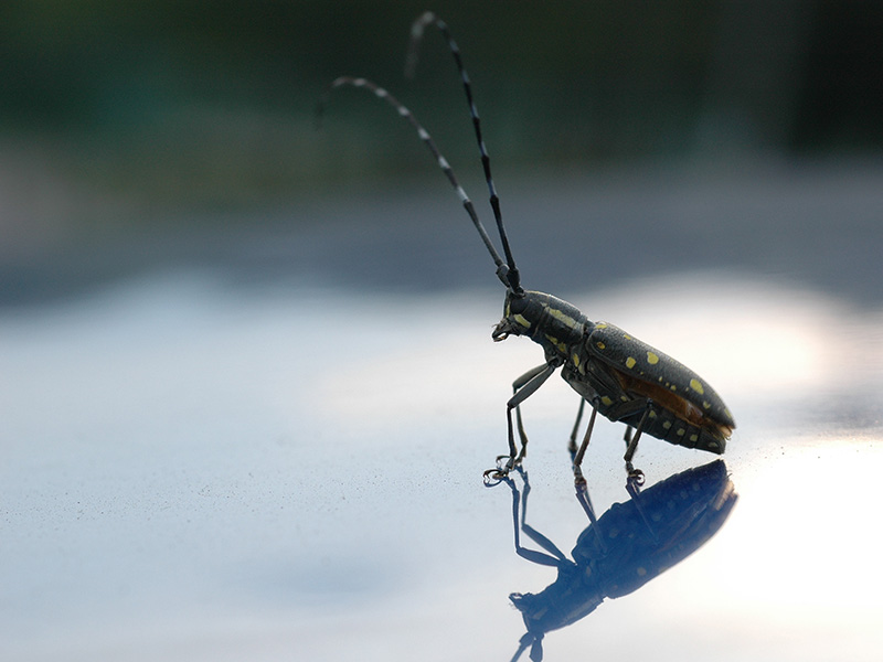 これじゃあんまり淋しいので、このカミキリの美しさ(横から見たときが美しく、真上からはどうもいけません)を際立たせるような一枚を狙っていたのですが、思いがけず、愛車の屋根の上でこれから翔びたとうとしているところが撮れました。車のボディへの映り込みと、開きかけたエリトラ、それに自然光の廻り具合も気に入っています。