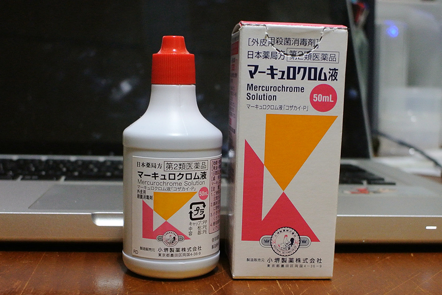 今は透明な液体の消毒薬や、アクリノール液があるので、しみないというメリットだけでは売れないでしょうけど、擦りむき傷の周囲が真っ赤に染まると、何となく安心した覚えがあります。