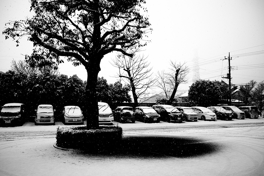 雪の積もり出した駐車場で、クスノキが力強く立っていました。