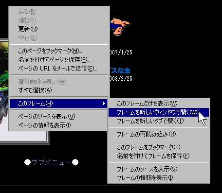 タブブラウズなんかとっくの昔にどれでもできて当たり前。で、フレームだけを開こうとしたんですが、コンテクストメニューに無い!!!!