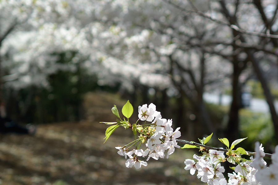 オオシマザクラとエドヒガンの交雑品種のひとつで、葉が少し開いた状態で開花しますが、純白の大きな花と若々しい葉の色のコントラストが爽やかです。やがて桜色に色付くと散っていきます。