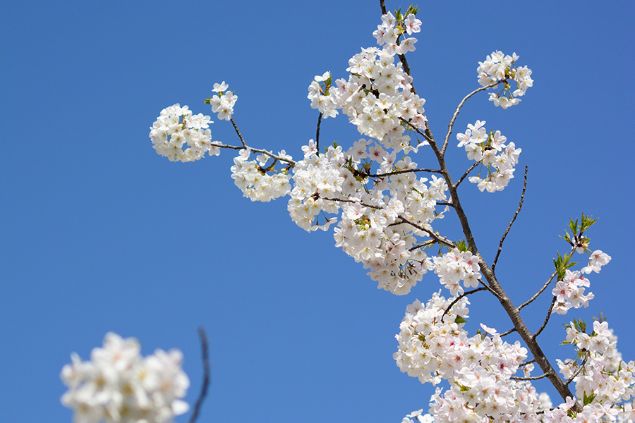オオシマザクラとエドヒガンの交雑品種のひとつで、葉が少し開いた状態で純白の花を開き、満開の頃から桜色に染まっていきます。