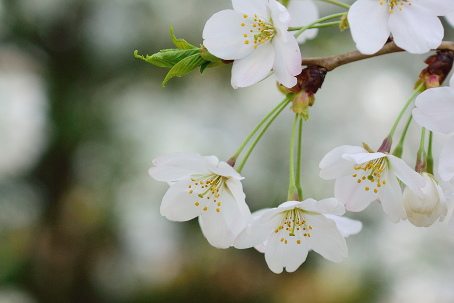 オオシマザクラとエドヒガンの交雑品種のひとつで、葉が少し開いた状態で純白の花を開き、満開の頃から桜色に染まっていきます。
