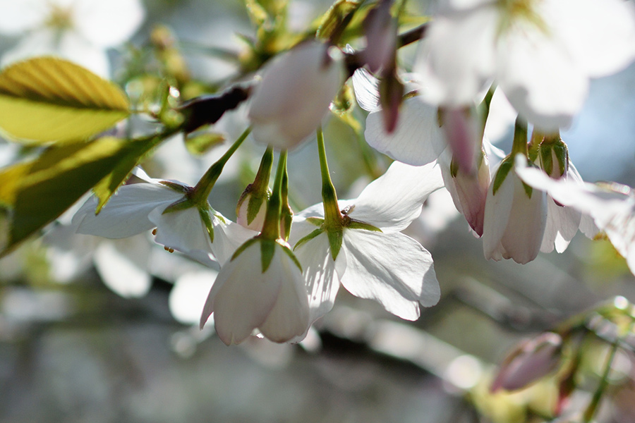 純白で大きく開花する美しい桜で、開花時には葉も展開しています。