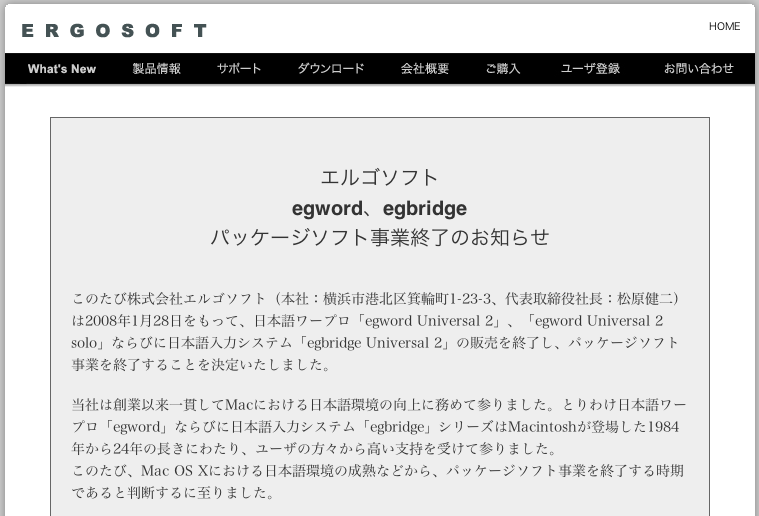 エルゴといえば古くからのMacユーザにはお馴染みですが、残念なことに撤退です。特に快適な日本語環境EGBRIDGEが消えてしまうのは、これから先の私の日本語環境を思うとお先真っ暗状態です。