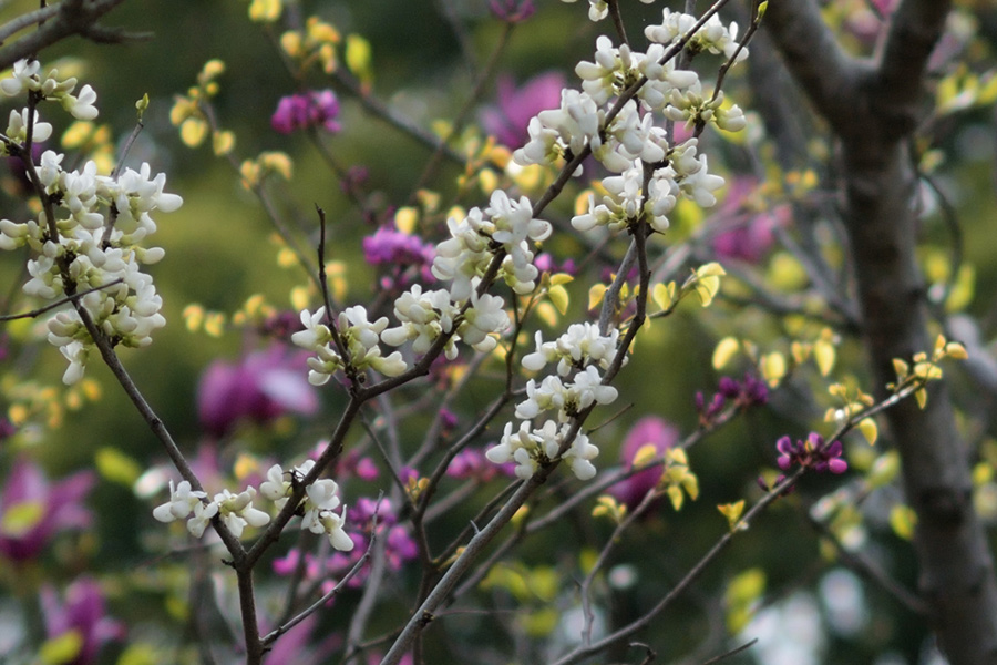 季節感覚的には桜と藤の間を慰めてくれる存在です。花は枝から直接咲きます。