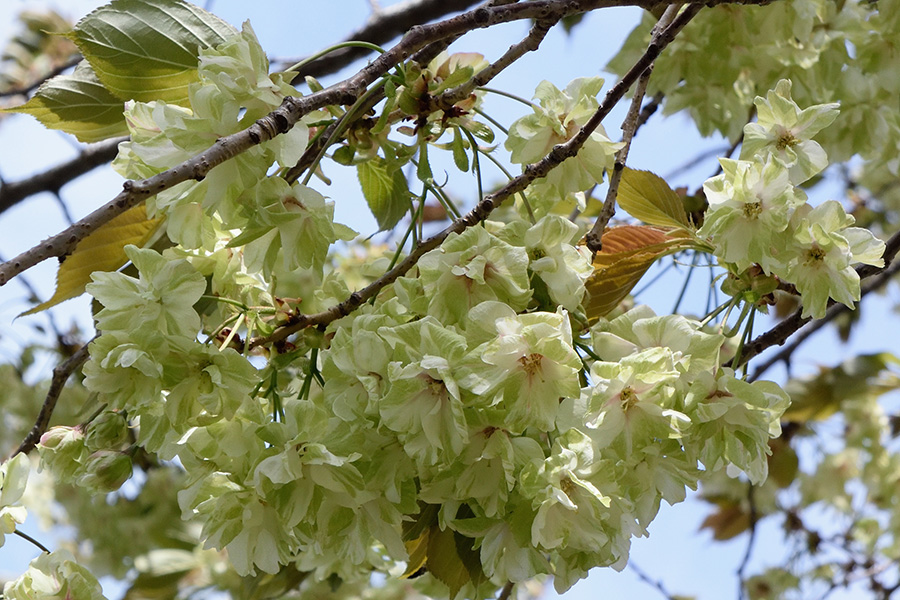 黄緑色の八重桜で、花弁を反り返らせるように開花します。ほぼ満開を迎え、中心に赤味が差してきました。花弁に葉緑体を持っている点はウコンと同じですが、ギョイコウには気孔まであるそうです。