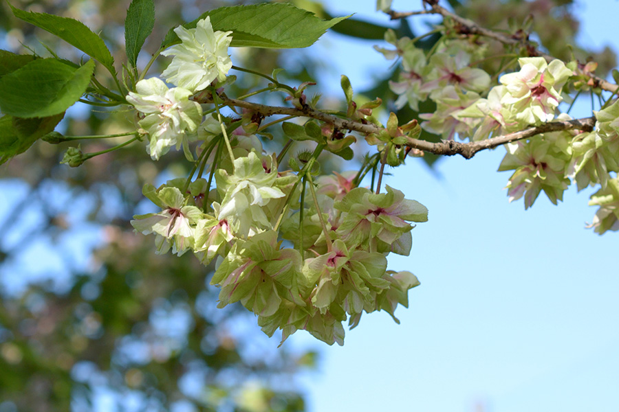 黄緑色の八重桜で、花弁を反り返らせるように開花します。満開を過ぎ、白かった部分が赤く染まり、花弁にも縦に走る赤い筋がしっかり見えます。