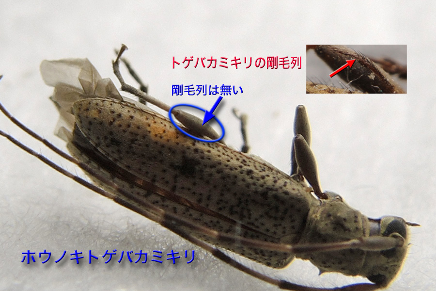 ホウノキの葉で採れば、間違いないはずですが、虫体そのものはトゲバカミキリとそっくりなので、後肢腿節上部剛毛列が無いことを確認します。