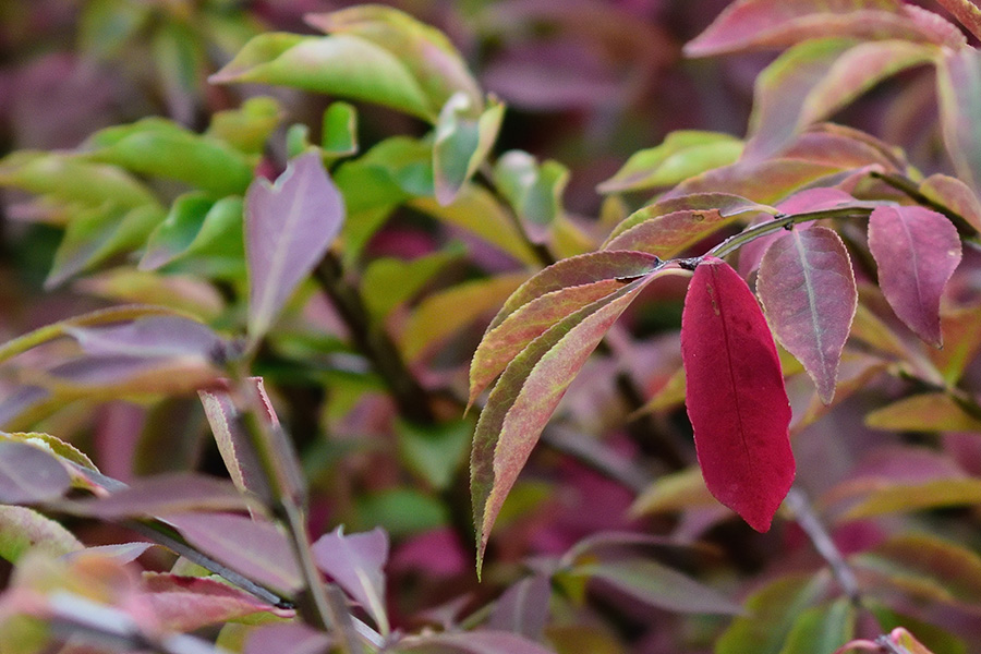 樹全体でも枝でもなく、葉事に色付いていくニシキギです。