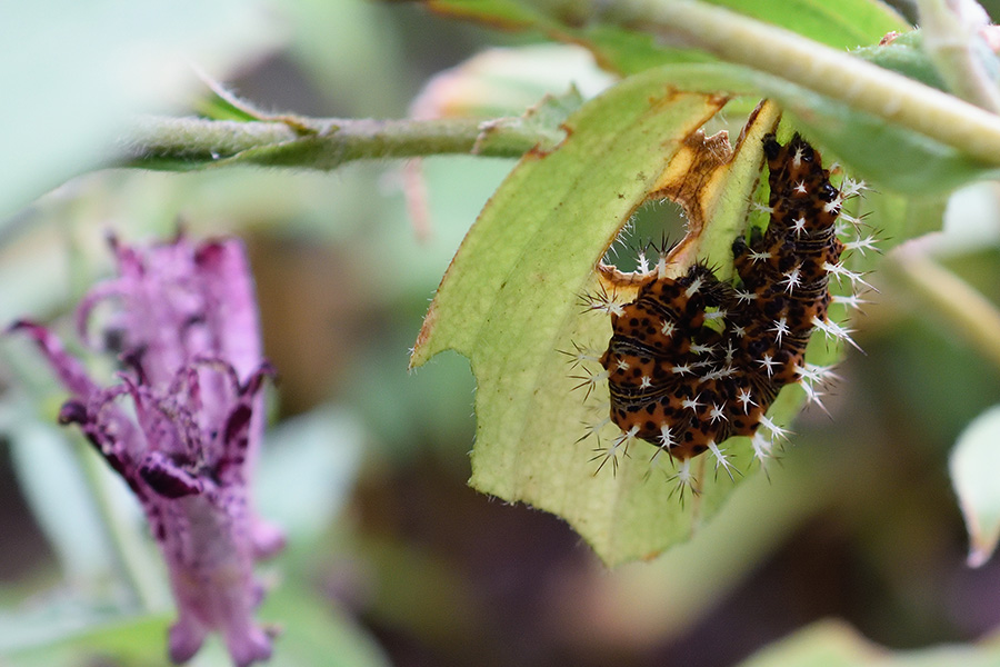 我が家の(タイワン?)ホトトギスを見事に食い荒らしてくれました。蛹化を前に下垂場所を決めたところでしょうか?