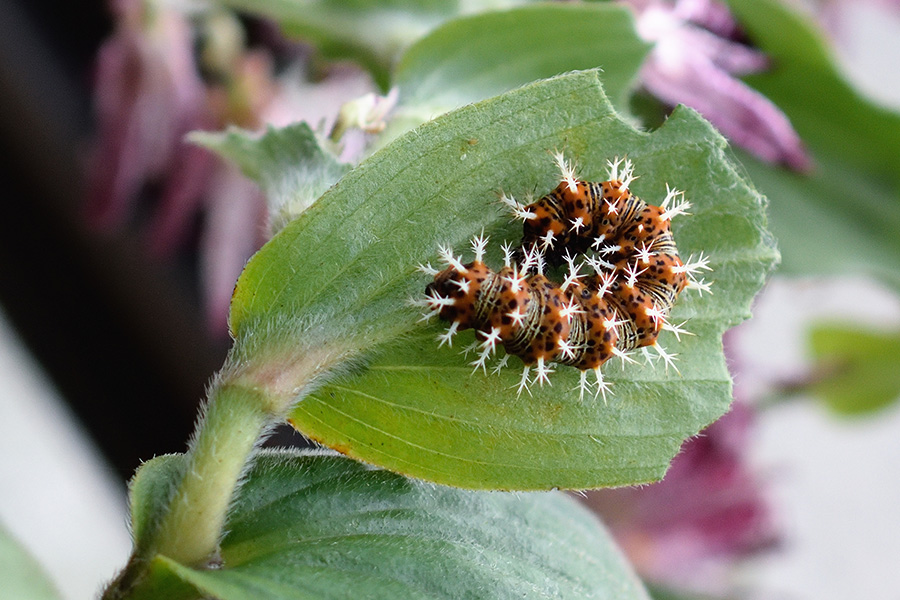 我が家の(タイワン?)ホトトギスを見事に食い荒らしてくれましたが、すべて終令になっており、花は無事咲いたし、葉も少しは残ったので好きにしてもらってます。