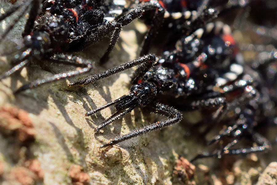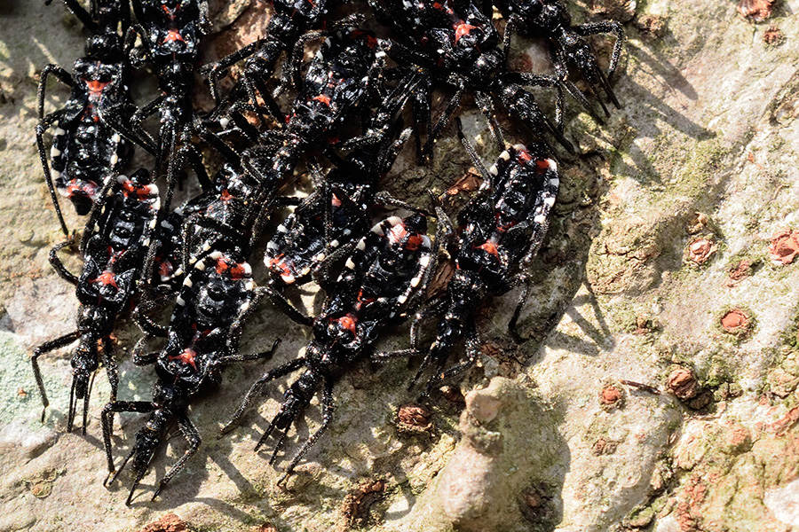 越冬というと樹皮裏に潜んだりするイメージがありますが、元々暖かいところの虫?だからか、表面で纏まっています。触角を折り畳んでいるのに初めて気付きました。