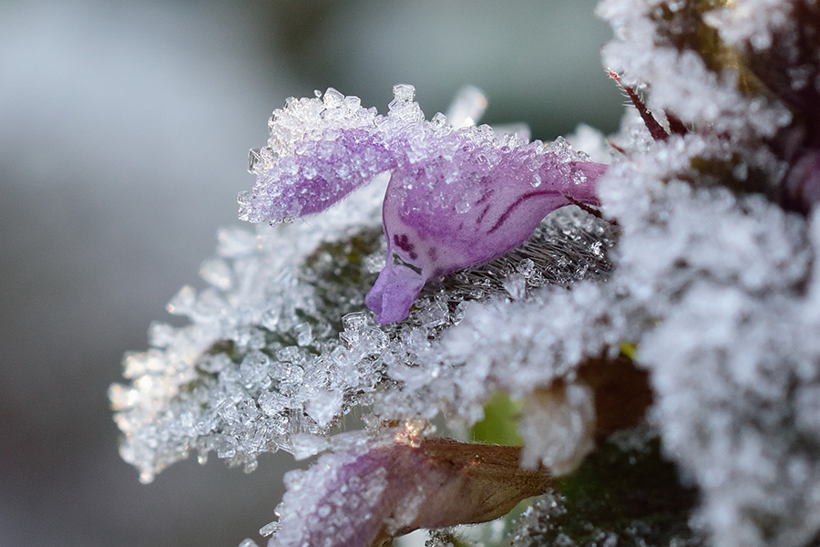 暖冬で開きはじめていたヒメオドリコソウに霜が降りていました。