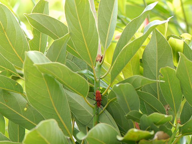 ぽとぽと落ちる赤いカミキリを見ながら、一時ゴマダラカミキリが街路樹にもついていたり、学校の樹をことごとく“食い物”にしていたことを思い出していました。