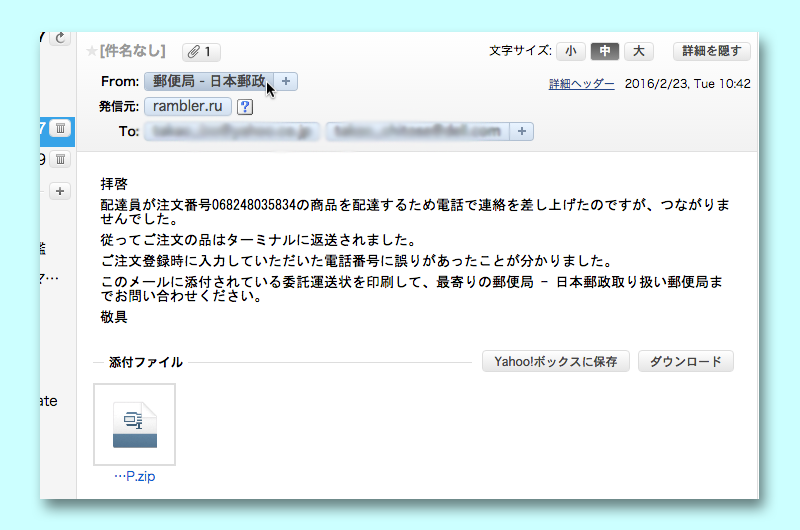 ただ、発信元を軽く偽装していて、見た目が日本郵政となっているため、こういう事例に不慣れな方は開いちゃう可能性があります。