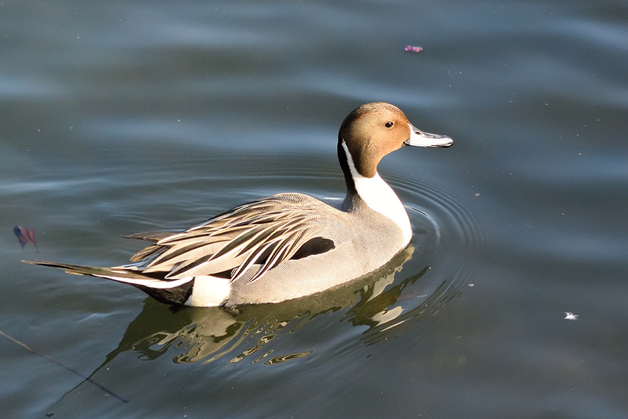冬になるとやって来ます。単独でいる♀は見分け難いですが、♂には特徴的なぴんと上に伸びた尾があり、嘴の色などと合わせ、比較的判り易いカモ!?あれ・・・