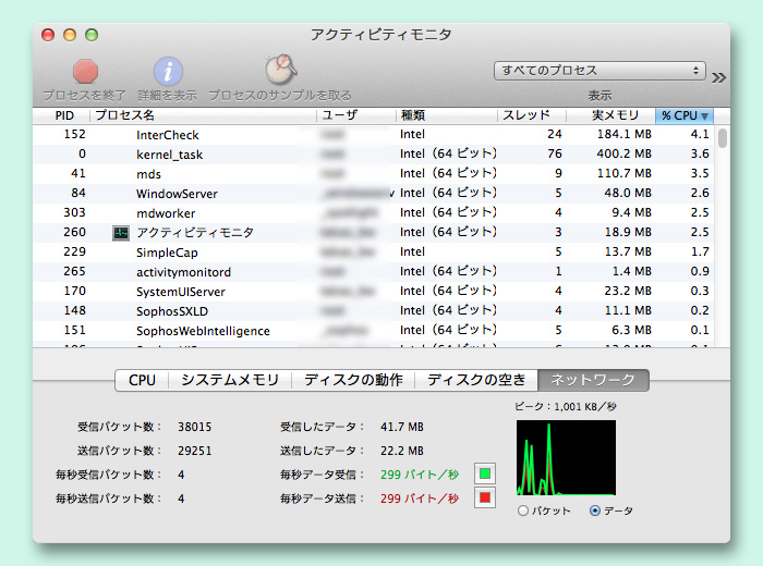 <私的備忘>Macの通信量は、アクティビティモニタで確認。表示されるのは起動からの総量。