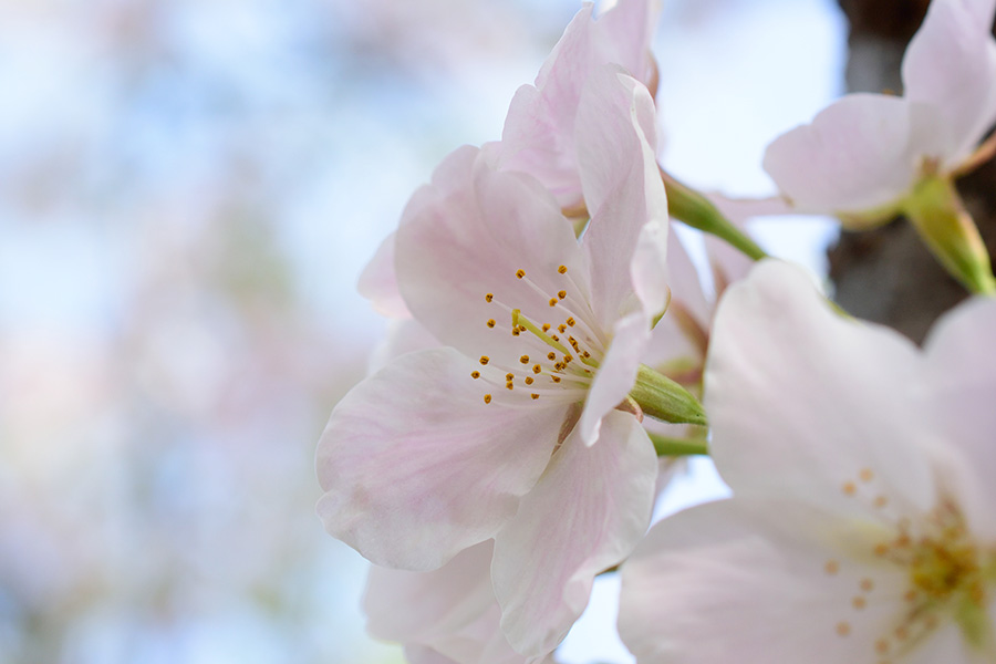 オオシマザクラとエドヒガンの交雑品種のひとつで、葉が少し開いた状態で純白の花を開き、満開の頃から桜色に染まっていきます。