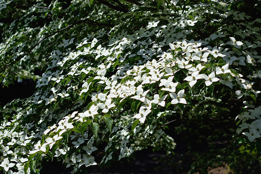 ハナミズキ(アメリカヤマボウシ)の花が終わった頃に咲きます。白く開いているのは総苞片と呼ばれるもので、花は中央に見える小さな緑の部分です。日当たりの良いところでは開花していましたが、まだ蕾の状態のものも多数ありました。