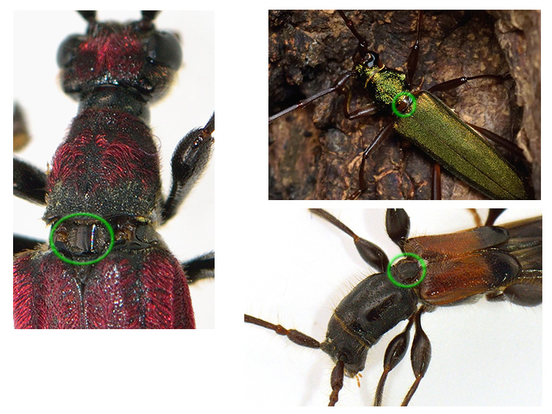 発音板は中胸背板の一部で、通常は前胸背板の下に隠れているのですが、場所は小楯(しょうじゅん)板のすぐ前なので、[首]を傾げたり、俯いたりすると見えてきます。