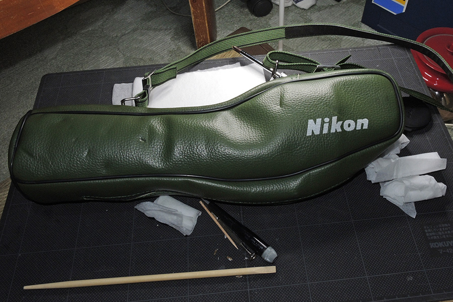 屋外に放置してあったプラスチックケースを開けたら、多分10年以上放置されていたと思われるフィールドスコープが出てきました。西日があたる場所に、発電機や投光器用のスタンドなどと一緒にケースに投げ込まれていたものです。