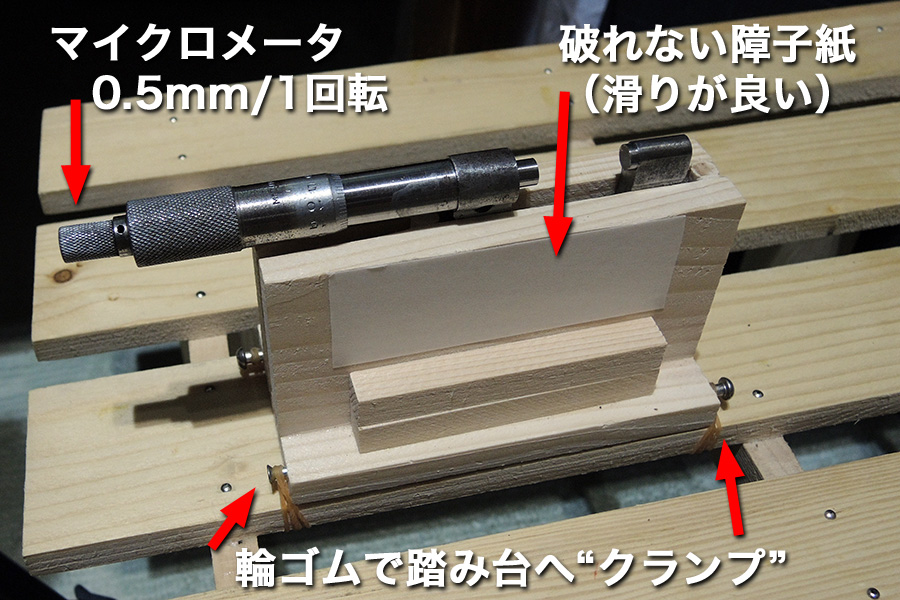 このステージをマイクロメータのスピンドルの先端で押し出すわけですが、押される部分をどうするかはちょっと悩みました。第一候補は家具固定用のL字金具でしたが、平面で受けるには面精度が粗過ぎて明らかに揺らぎが出るだろうと思い直し、ステージ裏にナベネジを1本植え、その頭で受けています。結果はなかなか好い塩梅でした。