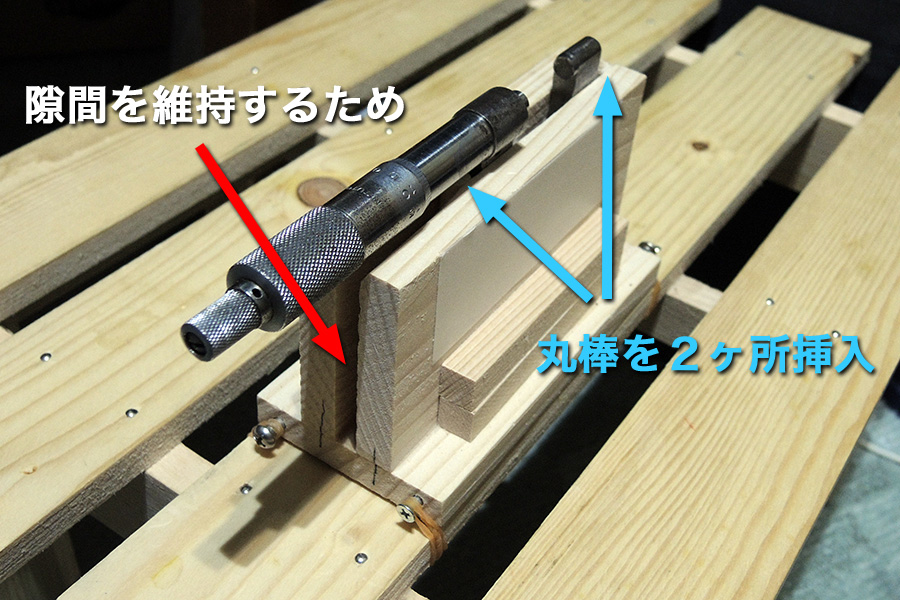 木材の弾力に助けて貰えるにしても、この部分だけは部材の緩みは困るので、隙間が決った段階で、支えとなる丸棒を2本挿して接着しています。