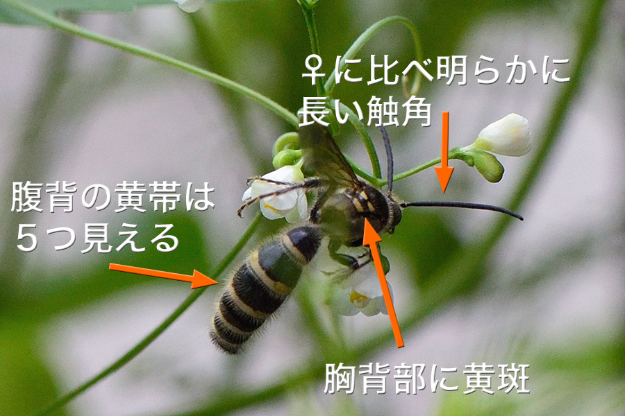 身近なハラナガツチバチは、他にキンケハラナガツチバチ、オオハラナガツチバチがいますが、本種の♂の胸背には黄斑が確認できます。