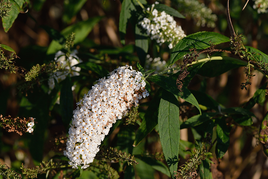蝶や虻がやってきていて賑やかでしたので、戻って奥さんに観てもらうと、『ブッドレアよ!』とあっという間に言い当ててビックリでした。調べてみると[フジウツギ]属の一種のようで、確かにウツギとフジを足したような印象なのに納得したのでした。