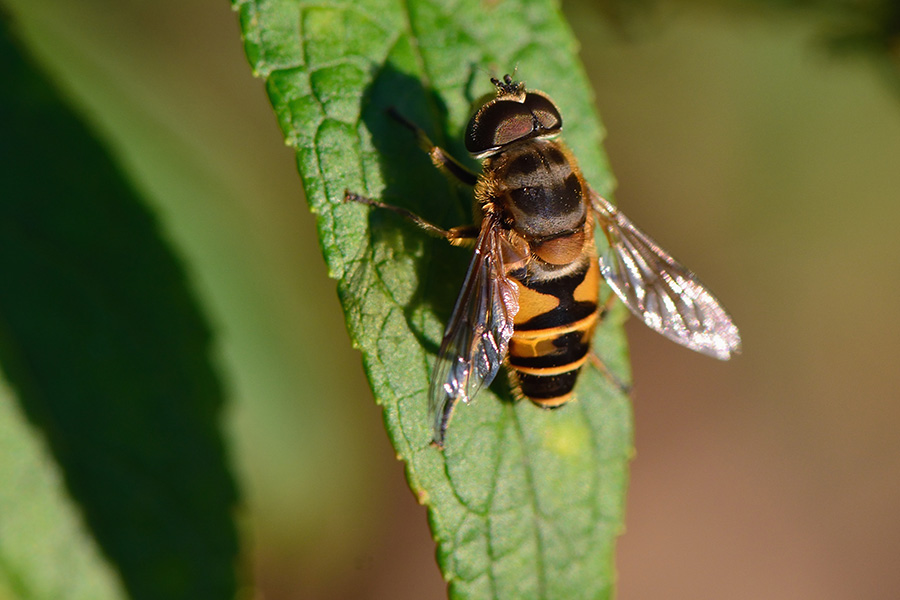 身近な存在だけを見回しても、多様を極める昆虫たちですが、双翅目(アブやハエの仲間)は特に難解と感じています。本種もハナアブ(ナミハナアブ)とよく似ていて、ネット上でも誤同定が多いようです。胸背部に縞がありますが、怪しい個体もあるので、後肢脛節上部の色(ナミハナアブは黒)も同時に確認できない場合はアップを諦めることになります。