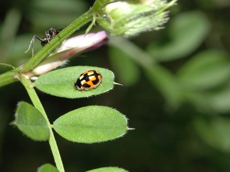 初夏の渓谷沿いの草叢でのひとコマです。良く見かける活発な小型のテントウムシです。節足動物をひとまとめにして『ムシは嫌い!』と宣言しているお嬢さんたちにも好かれたりする得な仲間です。