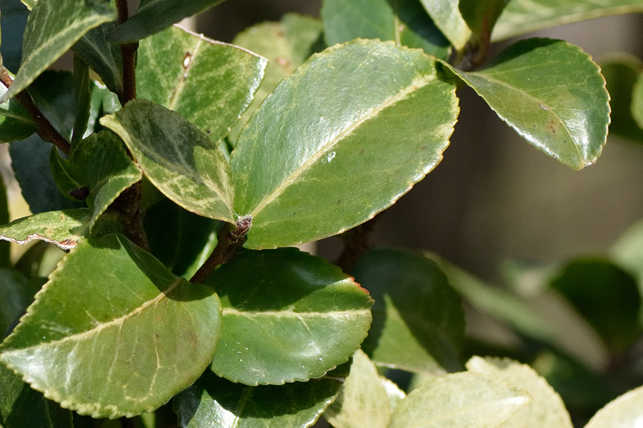 通常ツバキ(ヤブツバキ)に比べて、やや細身、葉柄は殆ど無いといえるほど短く、葉脈(側脈のような太いものも)が見え辛いのですが、園芸品種も多いようで、葉に斑が入っていたりすると、サザンカらしさが見え難くなります。