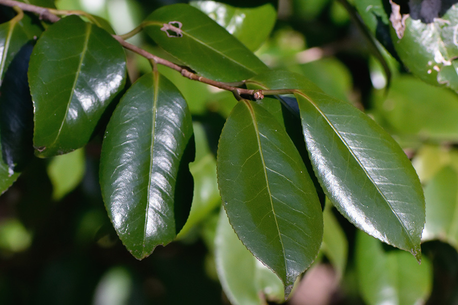 サザンカに比べて、丸みがあって、短いものの葉柄がしっかり伸びていて、葉脈(側脈のような太いものも)もはっきり見えています。