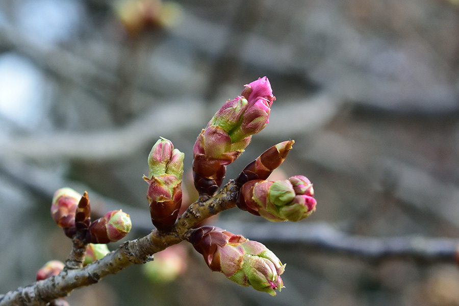 Buds of 'Yokohama-hizakura' in Kashiwa city, Chiba prefecture, Japan.