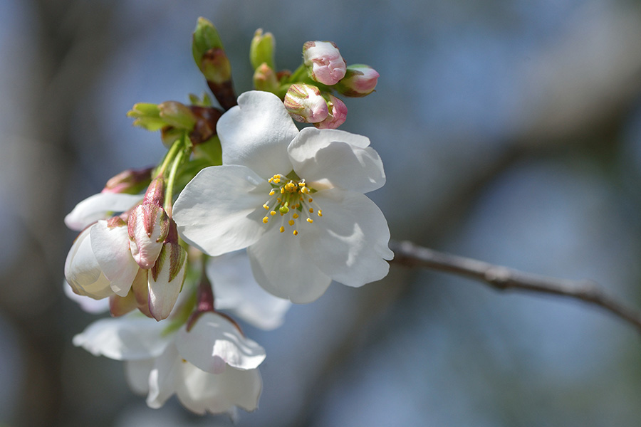 オオシマザクラとエドヒガンの交雑品種のひとつで、葉が少し開いた状態で純白の花を開き、満開の頃から桜色に染まっていきます。